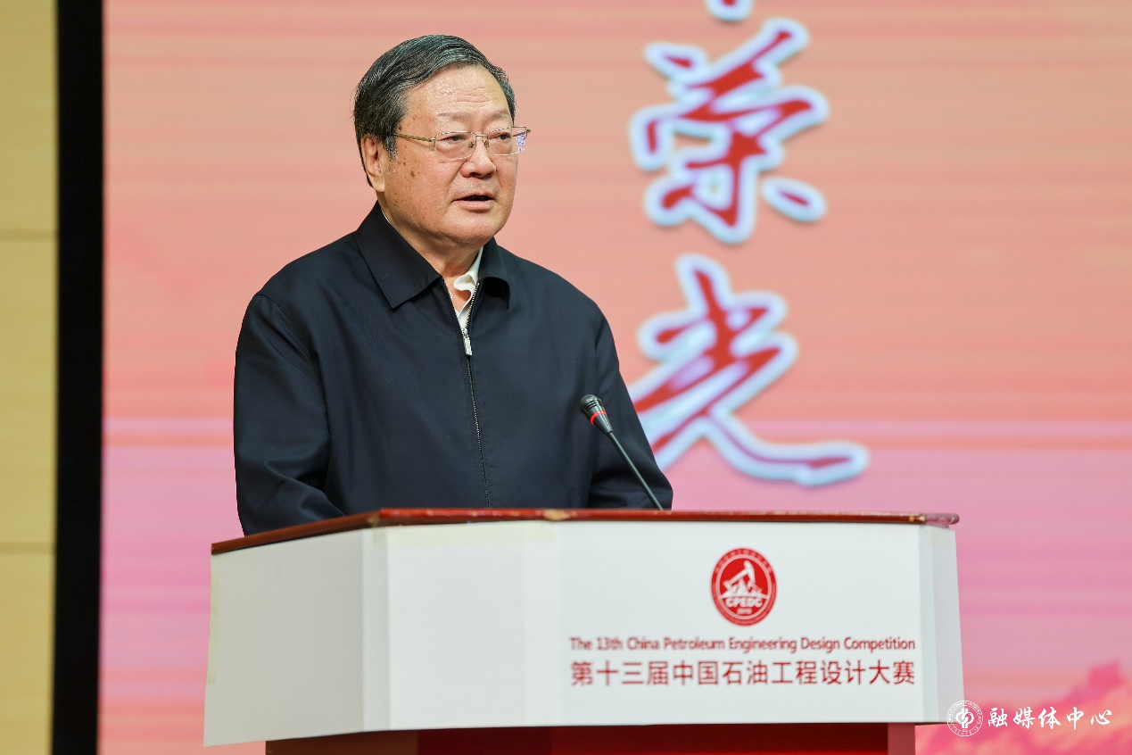 贾承造院士致辞,他对大赛获奖个人和团体表示祝贺,他表示,看到同学们以设计作品、制作视频、书法绘画等形式向以铁人王进喜为代表的一直奋斗在石油勘探开发一线的石油人致敬感到由衷的开心,希望广大石油学子们响应大赛“为石油献我青春”的精神号召,在学业生涯和整个人生奋斗中,立足石油行业,报效国家、奉献社会。