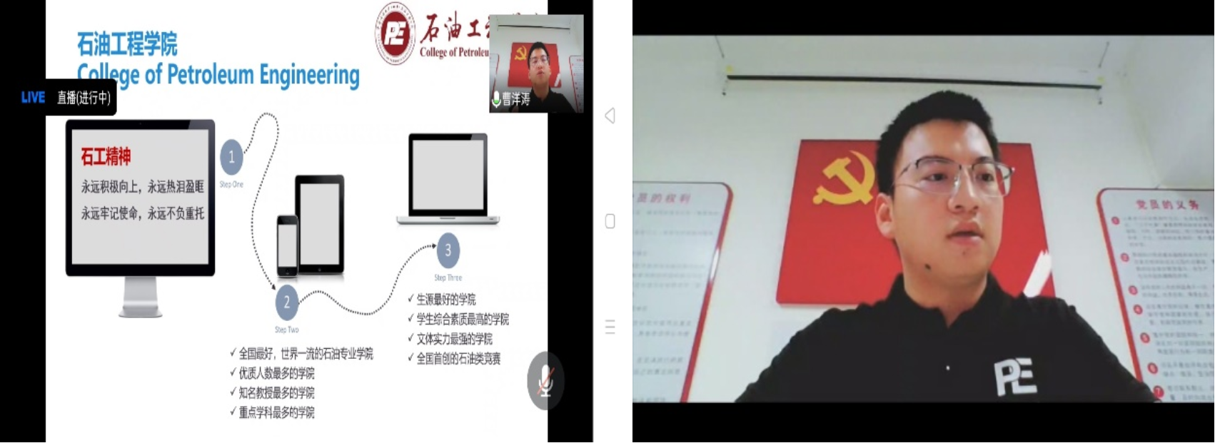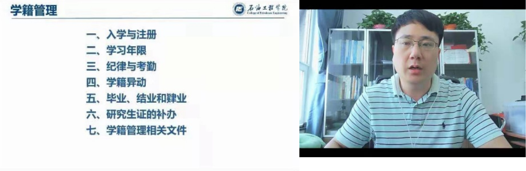 8月31日下午3点,为帮助2021级研究生更好实现身份转变、适应校园生活,本着疫情期间尽量避免组织大型集体聚集性活动的原则,石油工程学院2021级研究生新生入学教育暨研究生手册宣讲依托网络平台成功举行。石油工程学院副院长刘伟、全英文国际硕士班班主任杨睿月、团委书记刘东东、2021级研究生辅导员曹洋涛出席会议。本次大会由石油工程学院研究生会主席王蓓东主持。