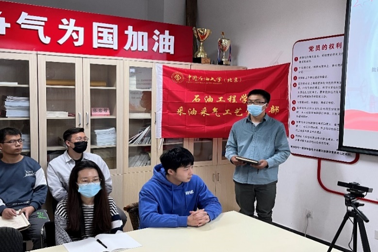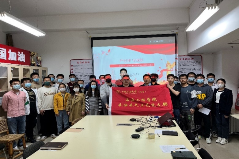 2022年4月28日下午,石油工程学院采油采气工艺党支部召开“严纪律 守规矩”主题党日活动,会议由党支书王彪主持,支部成员以线上线下相结合的方式参会,学院党委副书记刘东东、采油采气工艺党支部思想导师韩国庆出席会议。