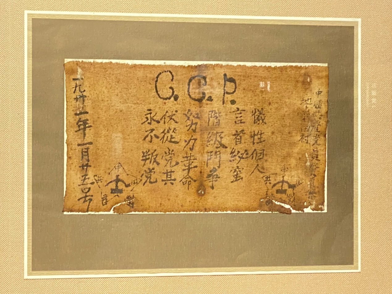 “革命理想高于天”。展馆里有一幅泛黄的粗布,上写着“C.C.P”和“牺牲个人”24字入党誓词,字迹不算工整,甚至还有错别字,却吸引了同学们驻足观看。“这是迄今为止保留下来最早的中国共产党人入党誓词。”讲解员向同学们介绍,1931年1月25日,永新县北田村农民贺页朵在自家榨油坊正式宣誓加入中国共产党,他激动地将宣誓词写在一块红布上表达自己的决心。红军长征后,贺页朵身负重伤,留在老家坚持斗争,他将这块写有入党誓词的红布用油纸包好,藏在榨油坊屋檐下。新中国成立后,这幅红布被捐献给文物部门。“它展示了农民党员对党的热爱之心和对革命的坚定信念。”