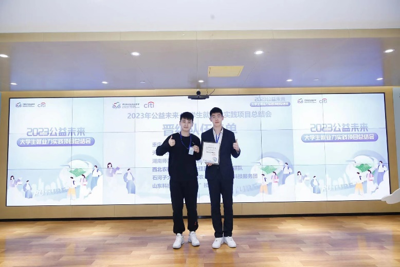 2023公益未来·大学生就业力实践项目是由中国乡村发展基金会(原中国扶贫基金会)发起、花旗银行(中国)有限公司捐赠支持的青年发展项目,该项目主要分为就业力课程培训和就业力实践活动两大板块,为来自全国遴选的26所高校的260支团队、千余名学生提供就业力实践公开课和社会实践锻炼机会,使大学生获得更好的就业适应力和就业竞争力。经校内项目方案遴选、落地实践、成果评选3个环节,团队从22个队伍中脱颖而出以第一名成绩代表学校参加总决赛。