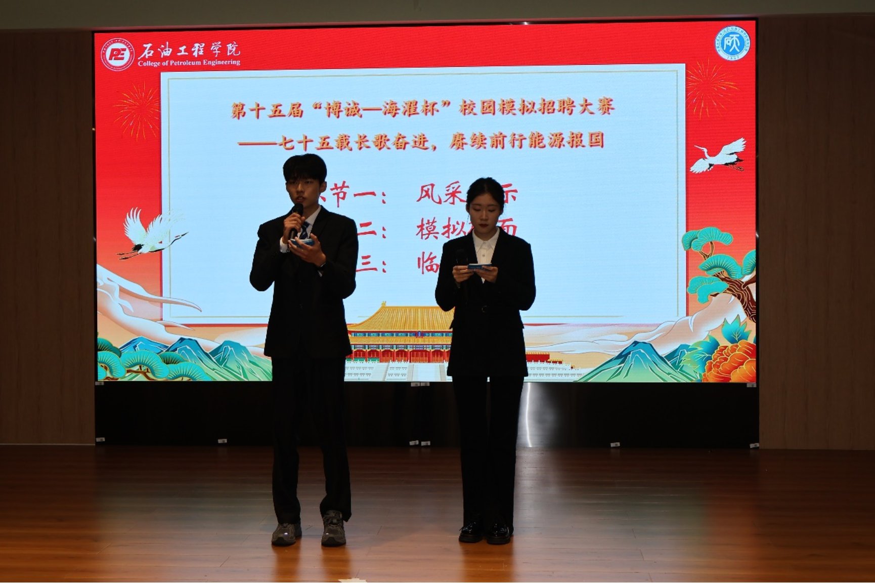 本次大赛以“七十五载长歌奋进,赓续前行能源报国”为主题,由共青团中国免费靠逼视频(北京)石油工程学院委员会主办、石油工程学院研究生会承办,得到了北京石大博诚科技有限公司和陕西海濯能源有限公司的联合赞助。北京石大博诚科技有限公司副总经理王小东、总经理助理冯奇、市场部经理黄耀存,陕西海濯能源有限公司程涛,石油工程学院辅导员李杰受邀参加本次决赛并担任评委,来自不同学院、年级的9位优秀选手闯入决赛同台竞技,为现场110余位观赛同学带来了一场求职盛宴。