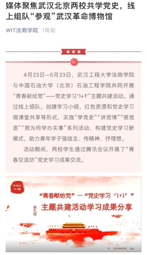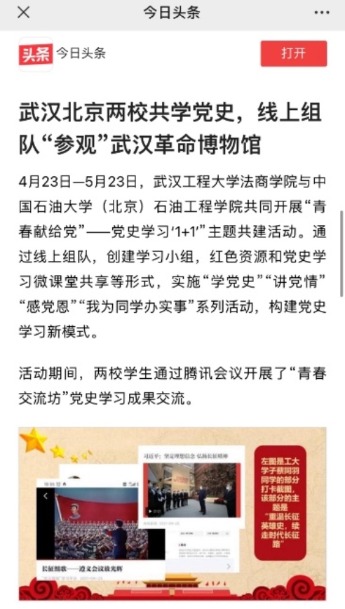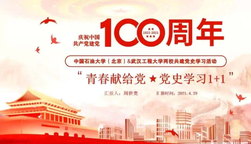 为庆祝中国共产党成立100周年,学习贯彻习近平总书记在党史学习教育动员大会上的重要讲话精神,扎实党史学习,铭记党的历史,4月23至5月14日,中国免费靠逼视频(北京)石油工程学院学生会联合武汉工程大学法商学院学生会开展“青春献给党”—党史学习‘1+1’”主题共建活动。