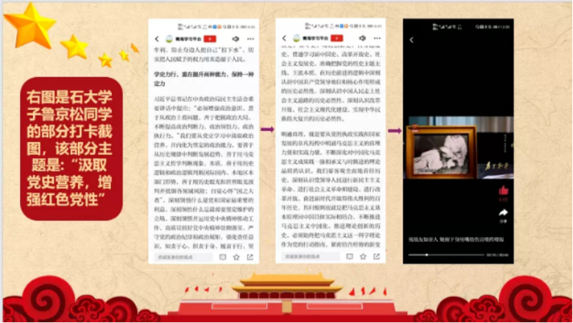 第三步,“青春笔墨堂”,感党恩,抒理想,勇担红色使命。两校学生通过录制视频、书写心得等方式表达对本次党史学习共建活动的收获和感受,共收到视频投稿64份、心得投稿68份。同学们抒发了对党更加坚定的信仰和热忱,明确了作为青年所要承担的时代责任。活动后续选取了其中优秀的内容,制作了“学党爱党”“学党增信”“学党明行”3期线上推文展示,将青春的笔墨继续传递。