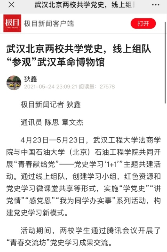 武工大的同学们前往武汉革命博物馆和毛泽东故居,与中石大学子线上分享党史学习教育体会,争做党史学习教育“网红博主”。