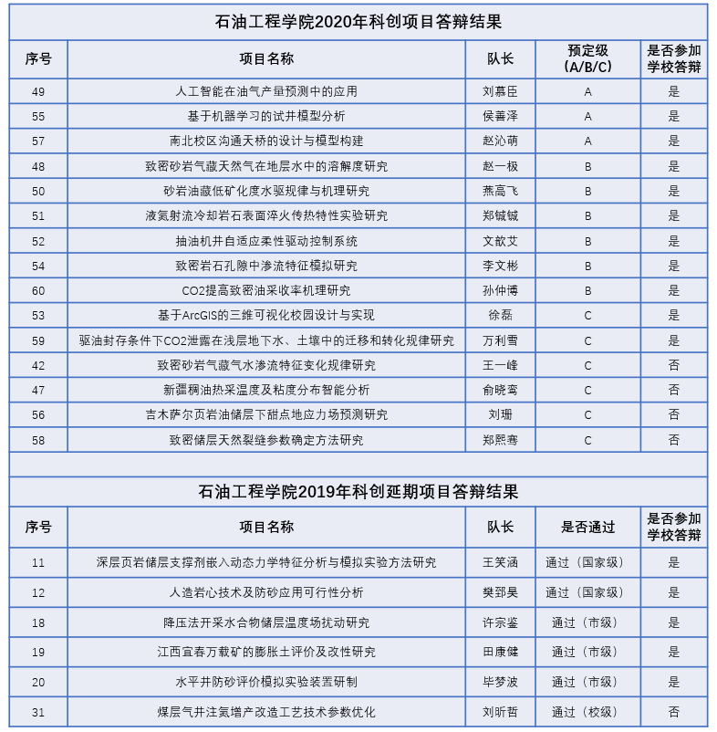 图3 石油工程学院2020年科创项目答辩结果