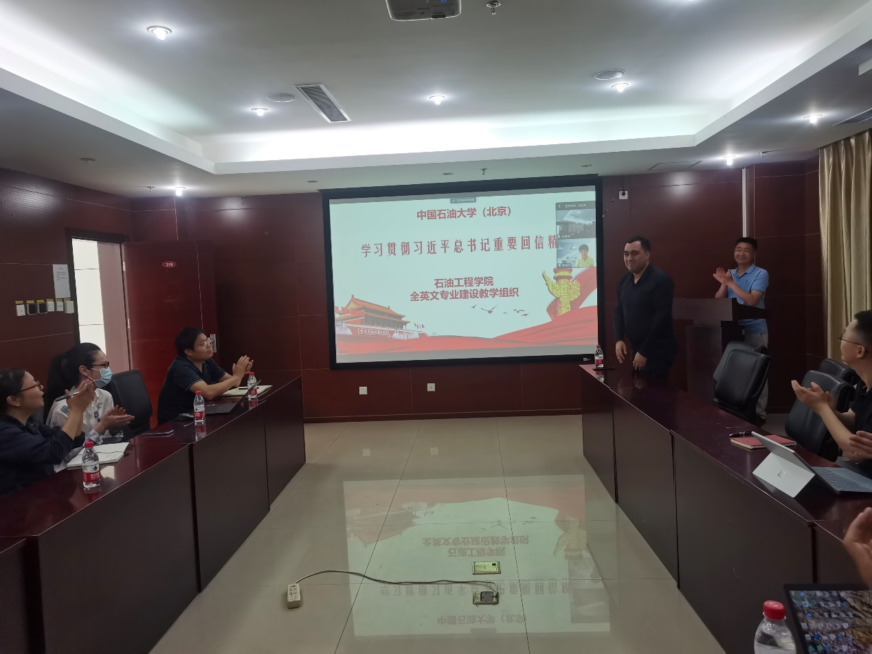 5月18日下午,石油工程学院留学生教学团队组织开展了以“学习总书记回信,提升留学生教学责任感”为主题的学习研讨活动。参会老师学习了习近平总书记在回信中对我校留学生教育的肯定和期望,纷纷表示回信振奋了精神,为更高质量培养留学生提供了动力,也为留学生教育提质增效的整体工作指明了方向。会上,教学团队围绕留学生专业课程建设、教材体系、实习实践、人才培养等展开了充分讨论,明确了下一步发展方向。留学生教学团队负责人郭小哲谈到,教学团队将充分汲取回信精神思想内涵,发挥学科专业优势,凝聚精神力量、激发奋斗干劲,为我校来华留学生人才培养谱写新篇章。