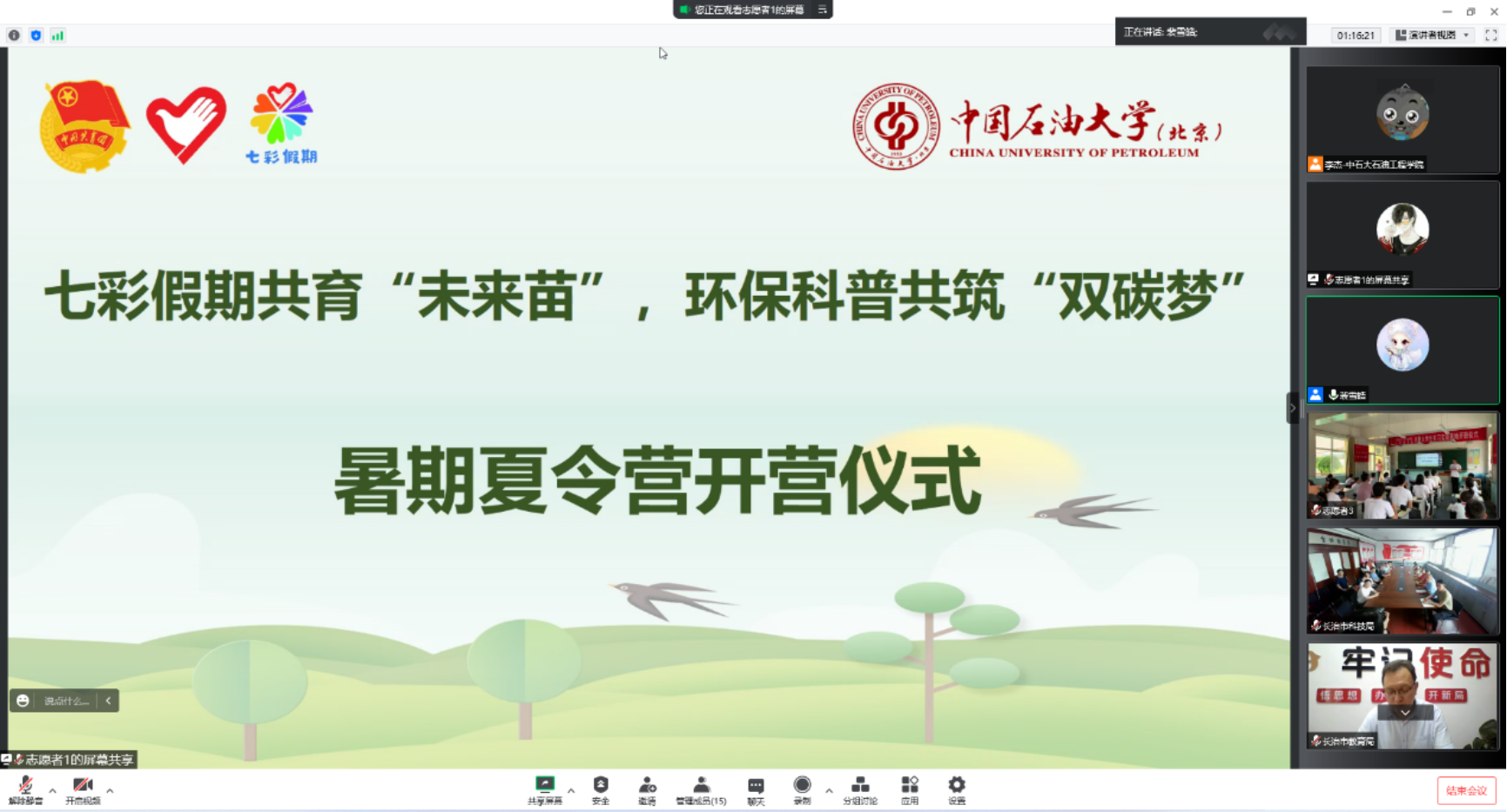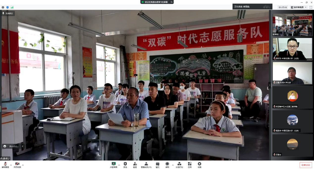7月14日上午,中石大石油工程学院举办“七彩假期共育‘未来苗’,环保科普共筑‘双碳梦’”暑期夏令营开营仪式。启动仪式采取线上线下相结合的方式进行,在山西省长治市沁县西关小学设立线下会场,在山西省长治市科学技术局、教育局、中石大石油工程学院设立线上会场。