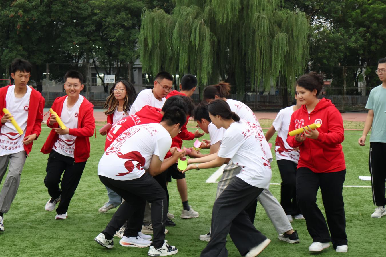 在第一个游戏校史学习“超英速”环节,各组队伍在队长和队员的密切配合进行比赛,从人员部署到比拼技巧都下足功夫,比赛过程紧张刺激,大家目标明确,干劲十足。同时本项游戏还融入了校史知识学习教育,在活动道具中与学校成立以来的重大历史事件结合起来,使学生在参与活动的过程中学习校史文化,培养爱校情怀。接下来,各队在“不倒森林”“珠行万里”“鼓动人心”“激情节拍”等活动项目中展开了智力与体力的大比拼,各个环节中团结协作、激烈角逐,在快节奏的体验中感受团队合作带来丰硕的成果。