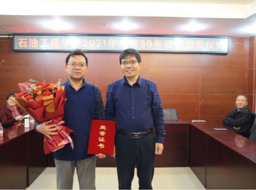 12月21日下午,石油工程学院2021年从教三十年证书颁发仪式在中油大厦A座310会议室成功举办。石油工程学院党委书记黄世军,宁正福教授、刘慧卿教授及十余名教师代表出席此次活动,本次证书颁发仪式由副院长兼工会主席王敬主持。
