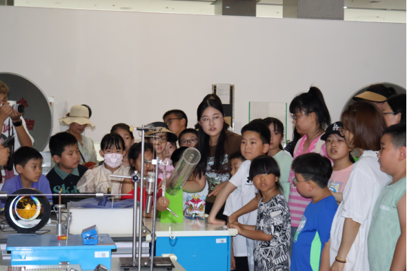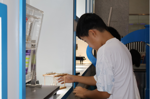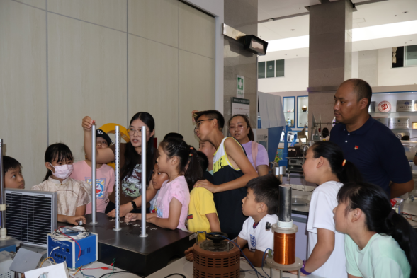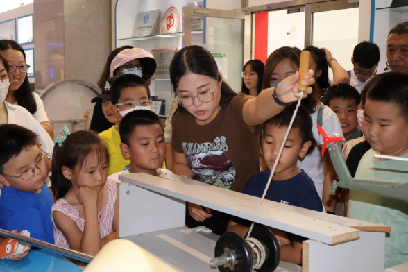 在“石油之光”全国科普基地,志愿者带领学生参观了锥体上滚仪器,伯努利原理演示仪,神舟号太阳能模型,手摸发电仪等设备,引导学生亲自动手尝试了共振原理演示,高压静电演示和光学实验等一系列物理实验。
