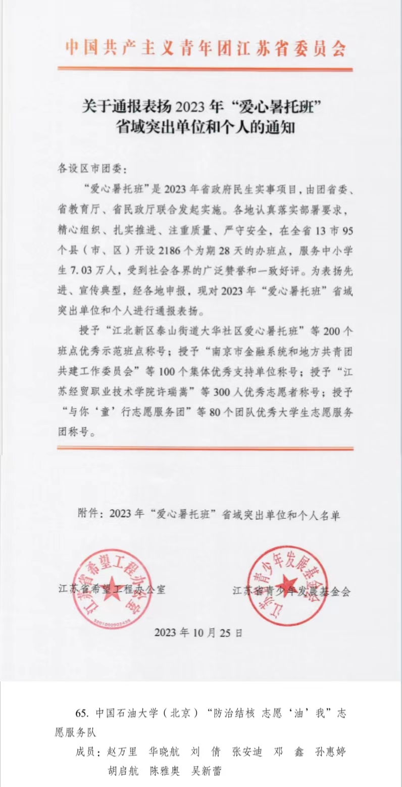 “爱心暑托班”是江苏省2023年省政府民生实事项目,由团省委、省教育厅、省民政厅联合发起实施。全省13市95个县(市、区)开设2186个为期28天的办班点,服务中小学生7.03万人。本次共授予80个团队优秀大学生志愿服务团队称号,中石大“防治结核 志愿‘油’我”志愿服务队成功入选。