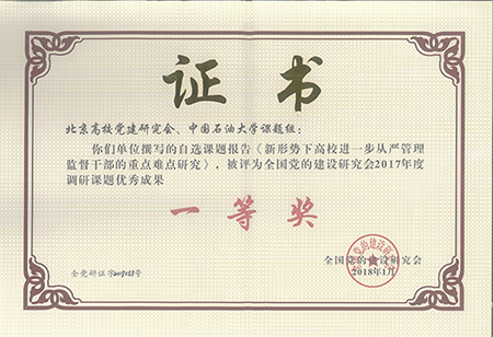 此次获奖是石大党委组织部承担的北京高校党建研究会2016年度重大课题的研究成果,曾被评为北京高校党建研究会2016年度优秀课题成果。课题研究过程中,课题组在中文核心期刊《学校党建和思想教育》上发表理论文章《高校从严管理干部的探索与实践》,形成了《调查问卷及分析报告》《新时期高校干部工作100问》《高校干部管理监督工作流程图》等实践成果。