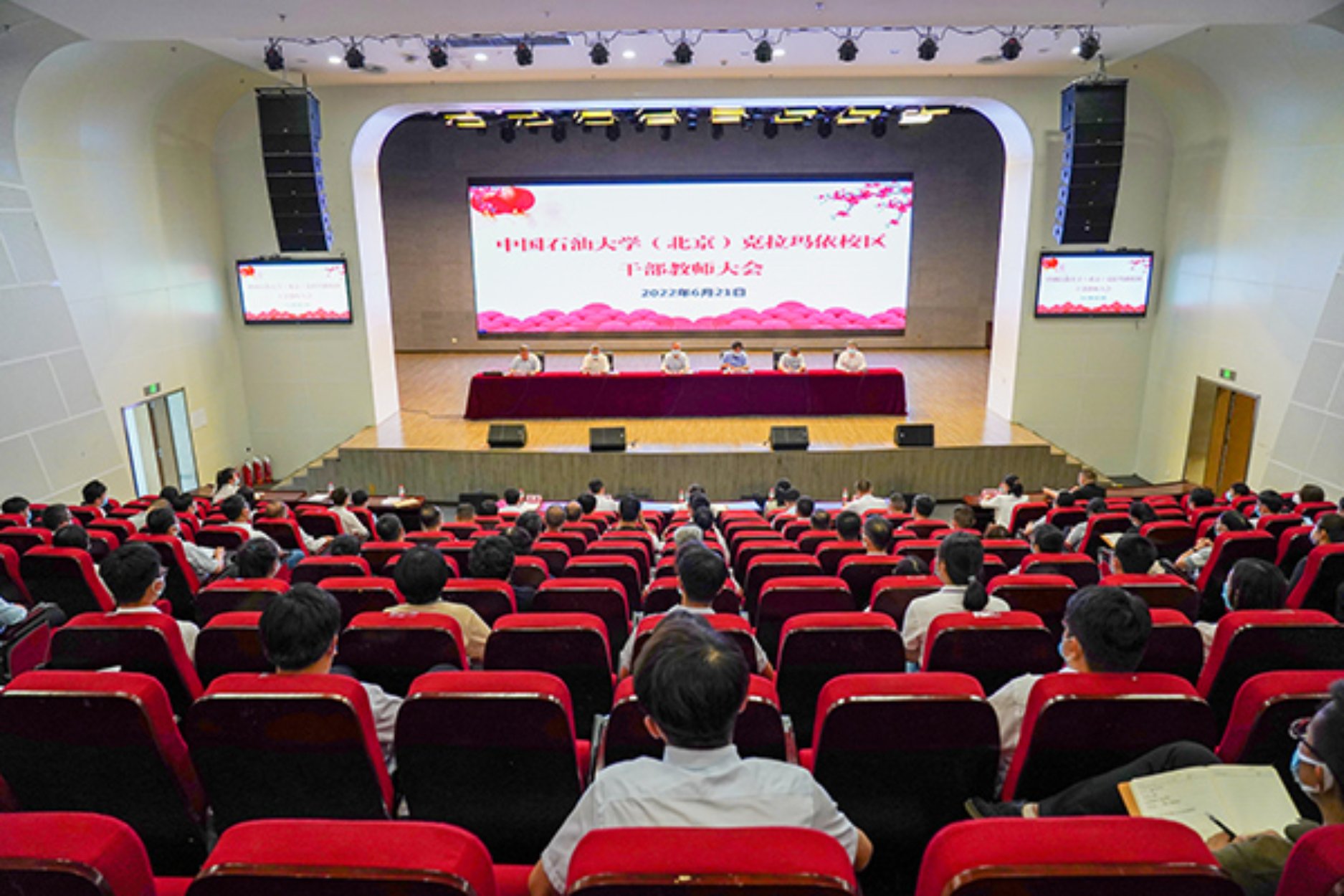 6月21日下午,中国免费靠逼视频(北京)召开克拉玛依校区干部教师大会,宣布学校党委关于校区有关领导同志任免的决定。学校党委书记陈峰,克拉玛依市委书记赵文泉、克拉玛依市委常委冯述江,校区领导班子成员、科级以上干部、系(副)主任和教工党支部书记参加会议。会议由学校党委副书记雷玉江主持。