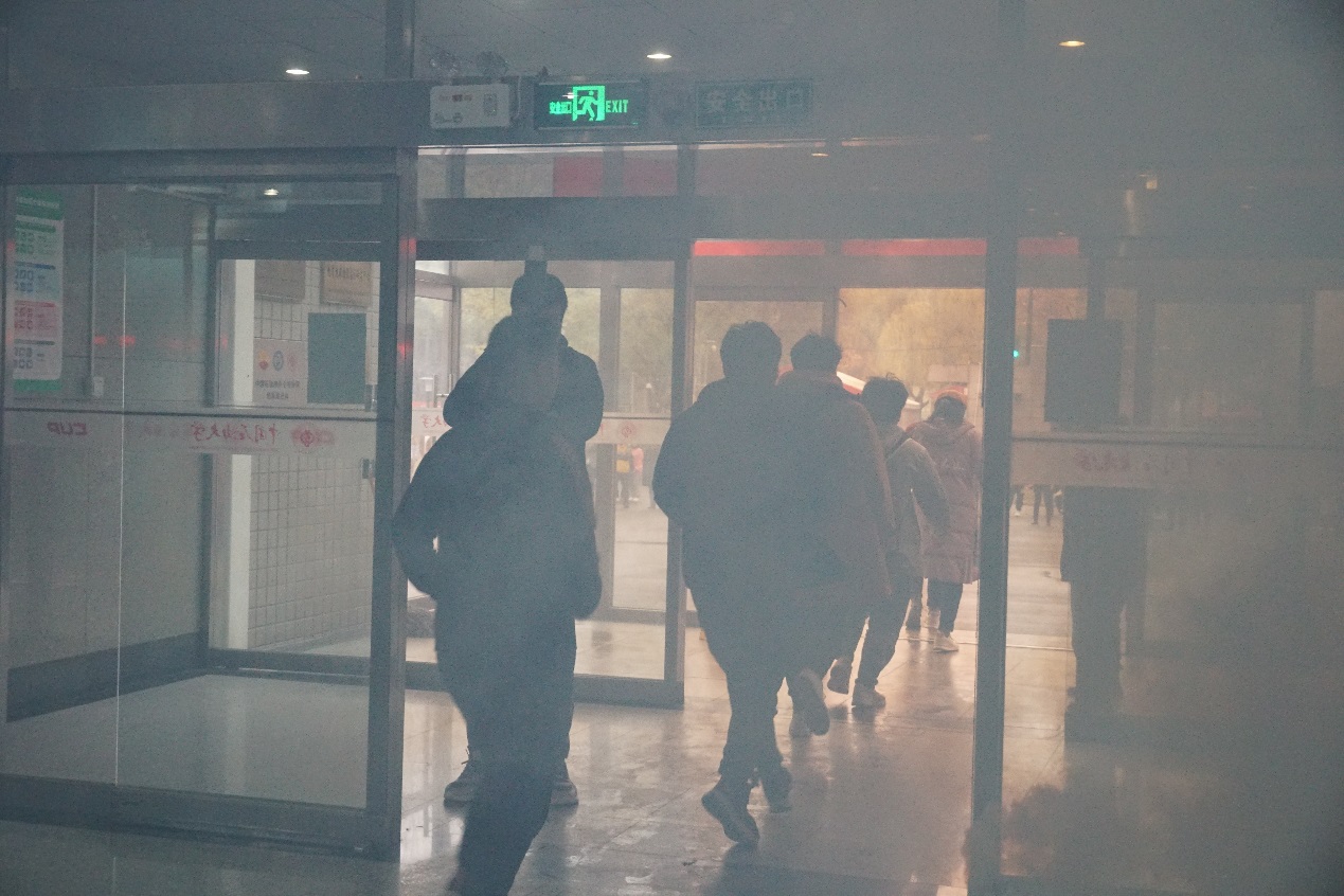 演练现场烟雾滚滚,触发感烟探测器报警,学校中控室接警确认火情后立即启动火灾应急处置预案,启动地质楼消防联动设备,疏散引导组立即打开地质楼所有疏散门,引导组织楼内师生疏散至安全区域集合。