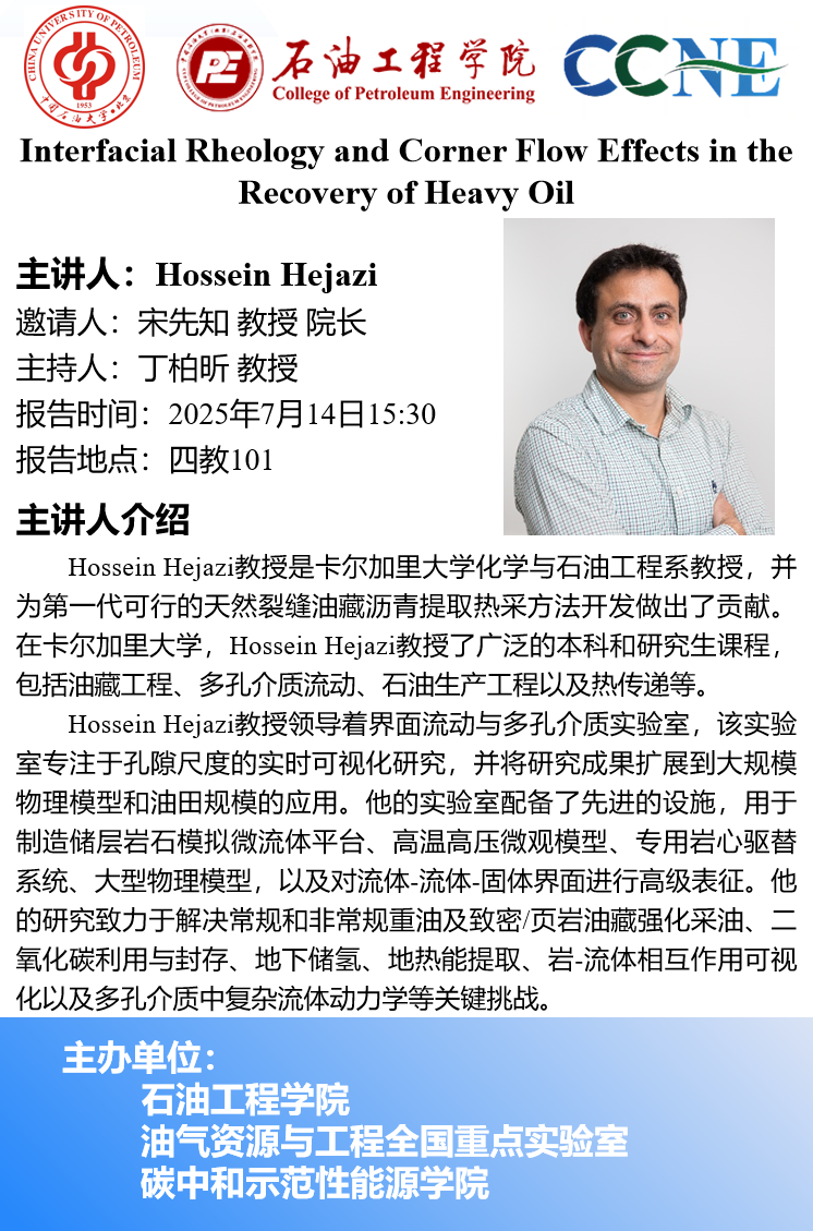 Hossein Hejazi(霍塞因·赫贾齐):卡尔加里大学化学与石油工程系教授,拥有机械工程专业的学士和硕士学位,并于2011年获得化学与石油工程专业的博士学位。在2013年加入卡尔加里大学之前,Hossein Hejazi教授曾在工业界工作,为第一代可行的天然裂缝油藏沥青提取热采方法开发做出了贡献。在卡尔加里大学,Hossein Hejazi教授了广泛的本科和研究生课程,包括油藏工程、多孔介质流动、二次和三次采油、石油生产工程以及热传递等。