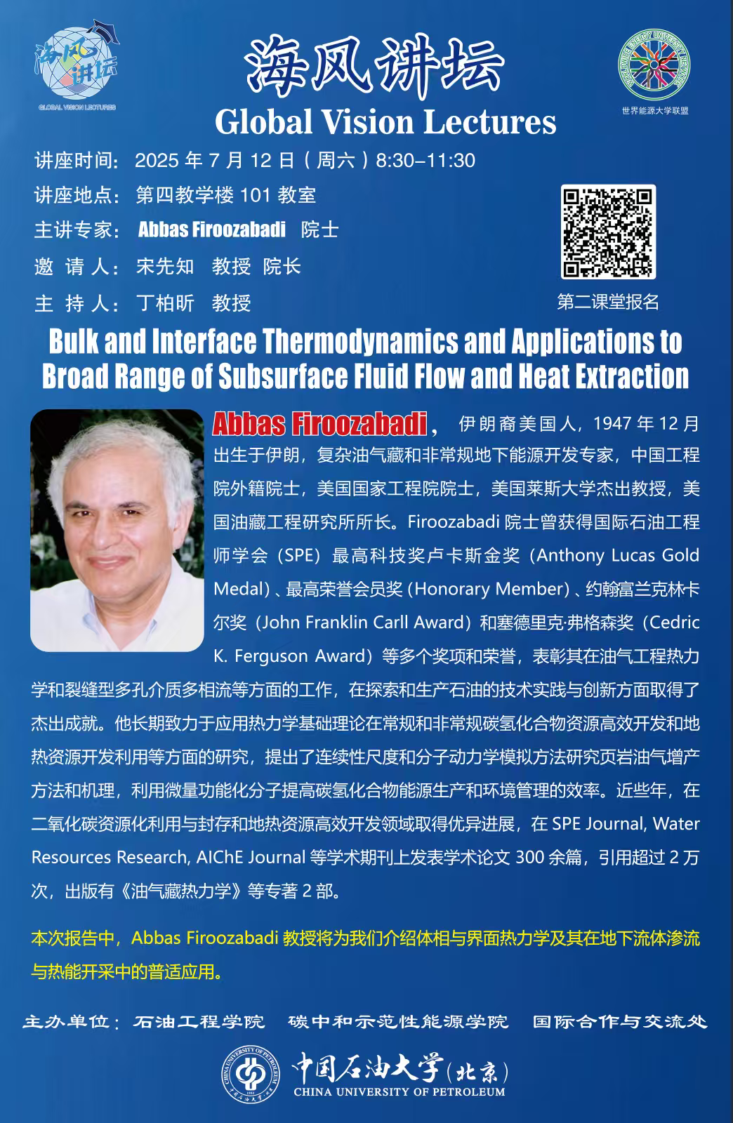 作为教育部与国家自然科学基金委员会联合主办的“全国研究生暑期学校”核心板块,本次特邀中国工程院外籍院士、美国国家工程院院士、莱斯大学Abbas Firoozabadi 教授与卡尔加里大学Hossein Hejazi 教授开设专题课程,深度解析热力学理论与界面力学理论在地下能源开发中的创新应用,赋能油气工程、地热资源开发和CO2 地质利用与封存核心技术突破。