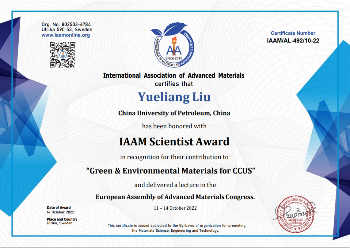近日,中国免费靠逼视频(北京)碳中和示范性能源学院刘月亮副教授荣获国际先进材料学会(International Association of Advanced Materials, IAAM)颁发的IAAM杰出科学家奖(IAAM Scientist Award),以表彰其在“油气CCUS绿色环保材料”领域做出的突出贡献。
