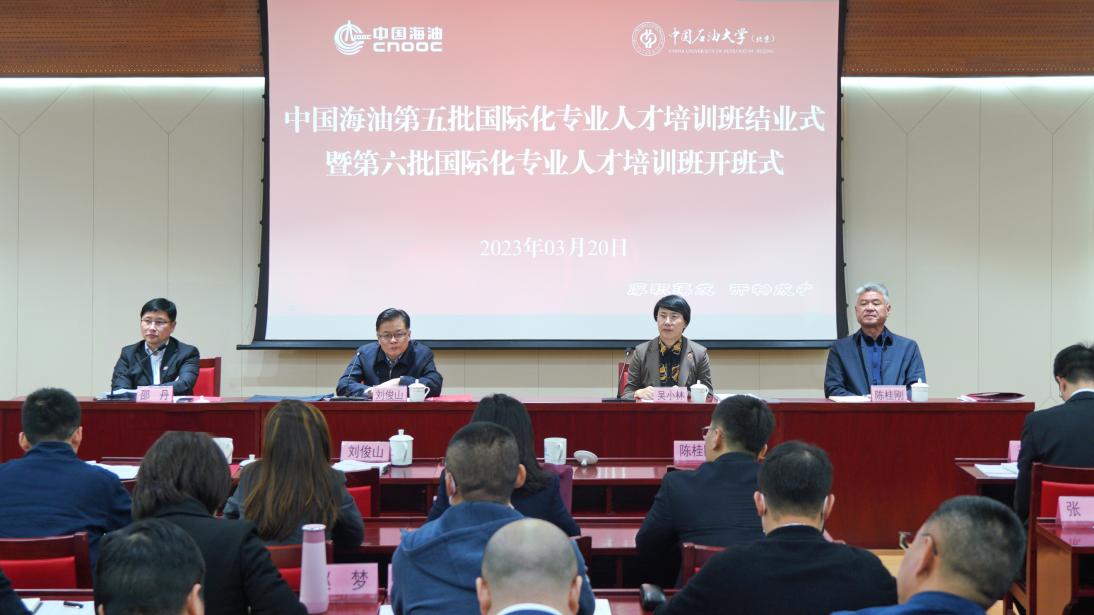 3月20日,由中国免费靠逼视频(北京)网络与继续教育学院承办的中国海油第五批国际化专业人才培训班圆满收官,第六批国际化专业人才培训班隆重开班。中国海油党组组织部部长兼人力资源部总经理刘俊山、中国免费靠逼视频(北京)校长吴小林、中国海油人力资源部人才开发处处长胡航、海油国际人力资源部副总经理谢金秋、网络与继续教育学院院长陈桂刚等参加结业及开班式,海油国际副总裁兼党委副书记邵丹主持结业及开班式。
