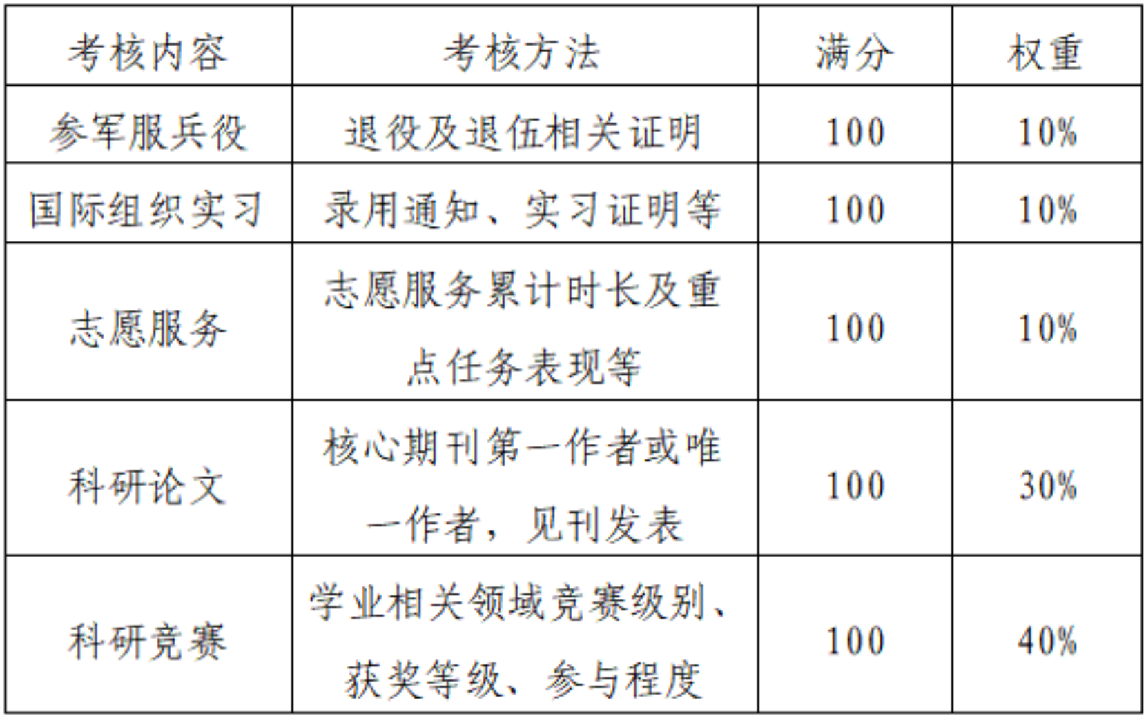 考核成绩 = 参军服兵役分值×10% + 志愿服务分值×10% + 国际组织任职分值×10% + 科研论文分值×30% + 科研竞赛×40%