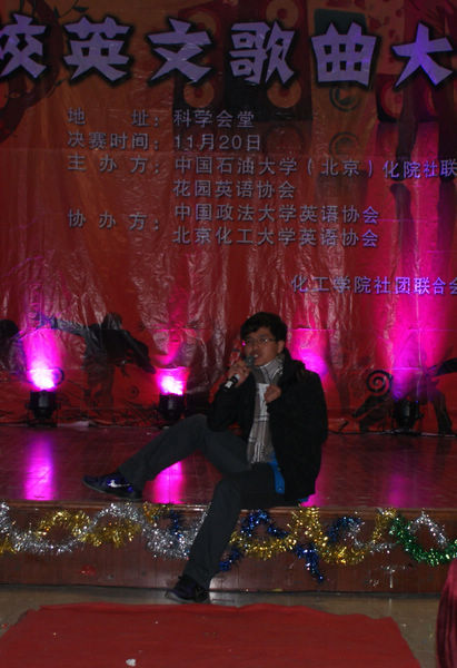 比赛伊始,我校街舞社的精彩开场舞,给观众带来了非比寻常的视觉冲击,随后是9位选手各具特色的自我介绍。比赛中,每位选手都张扬着非凡的个性,整场比赛精彩纷呈,每一轮比赛结束,赖达富老师和外教Shawn都会对每一位选手做专业的点评。比赛结束,嘉宾姜聪一曲《K歌之王》再次将全场气氛推向高潮。
