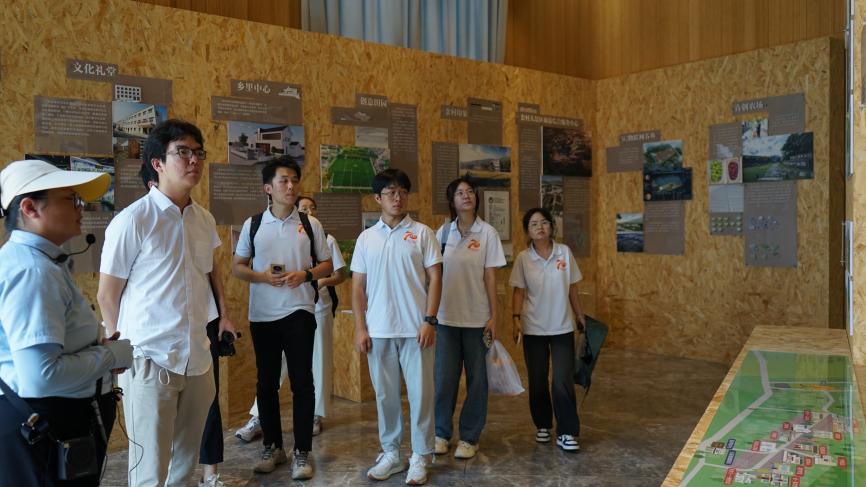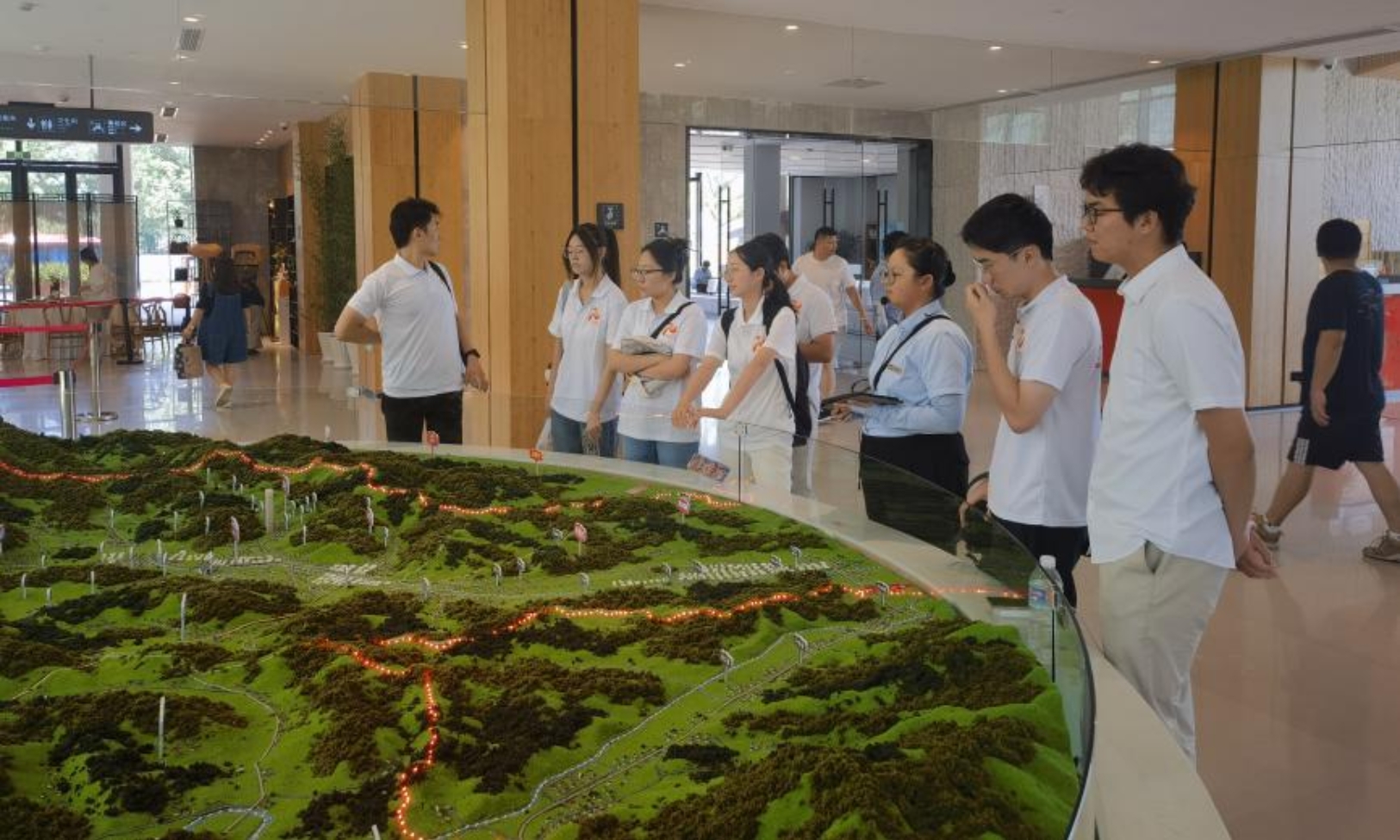 随后,团队来到了余村文化礼堂·数字影院,观看浙江开展乡村振兴的专题纪录片,了解安吉践行绿色发展的一路历程。影片中提到,上世纪八九十年代,余村人靠挖矿山、建水泥厂,生活富裕了起来。可是好景不长,环境污染问题日益突出。2003到2005年间,安吉县确定了“生态立县”,村里关停了矿山和水泥厂,开始封山育林、保护环境。湖州的“共富班车”也在这里启程。观看完余村变迁历程纪录片之后,实践团队长朱金铸深有感触,表示:“余村的一系列转变,让我深受震撼,在关停矿山和水泥厂之后,年轻人纷纷前往外地打工,到现在年轻人愿意在家乡开民宿、创业等支持余村的发展,深深感受到‘绿水青山就是金山银山’理念带给余村的机会和发展,让两山理论真正应用于实践,证明了经济发展不能以破坏生态为代价,以破坏生态为代价进行经济发展是不长久的,生态本身就是经济,保护生态就是发展生产力。”