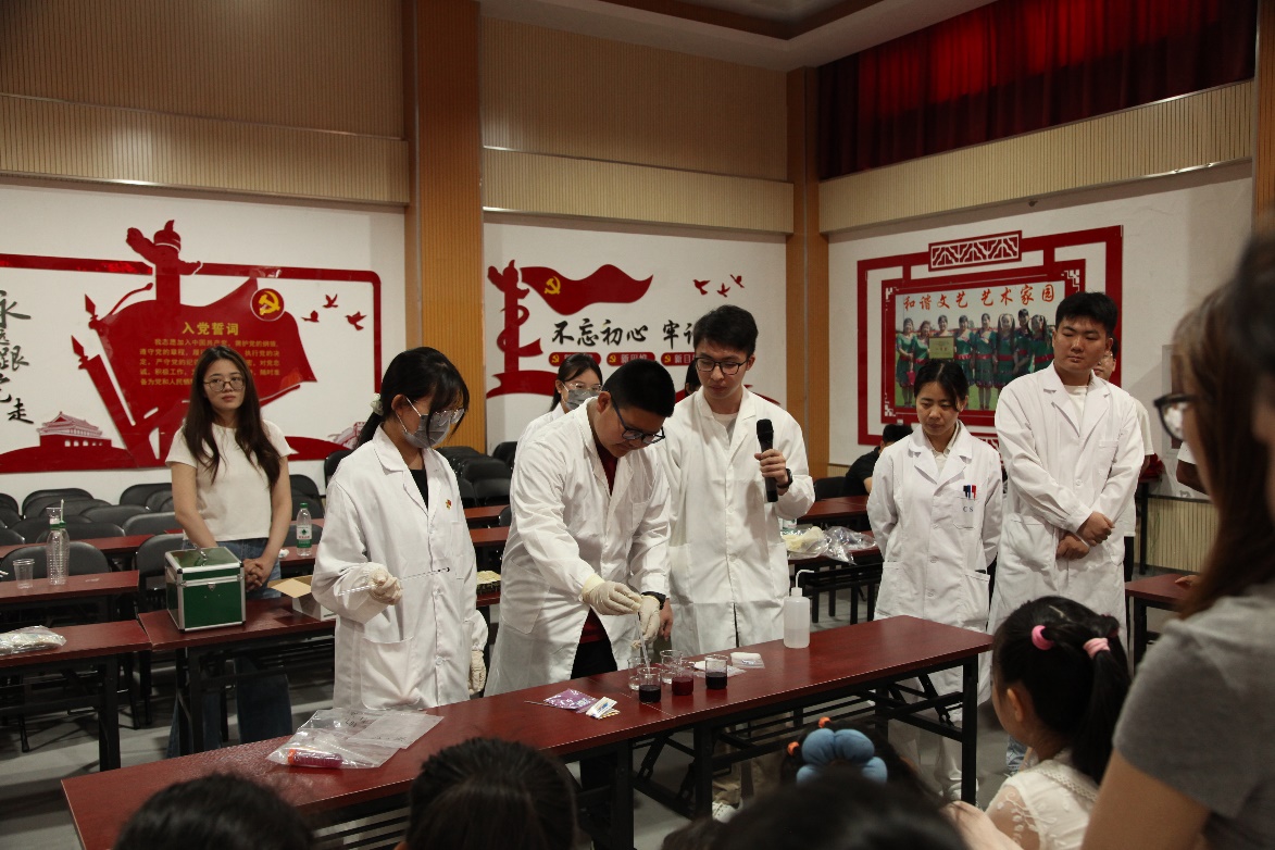 学生党员带小朋友共同完成“酸碱彩虹—会变色的紫甘蓝”实验