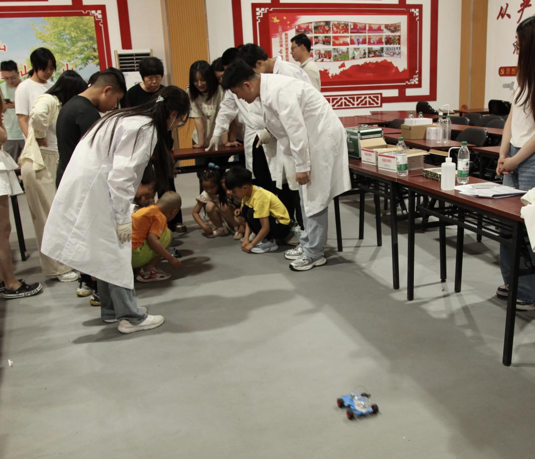 趣味科学实验课堂以 "安全筑基、能源关联、动手探秘" 为主线,将活动推向高潮。党员们结合能源知识与原理展开实验演示,孩子们在他们的指导及安全负责人的监督下动手参与,依次完成了“虹吸大揭秘”、“酸碱彩虹—会变色的紫甘蓝”、“会吹气球的瓶子”、“盐水动力车”趣味实验。特别在盐水动力车实验中,孩子们分组比拼,制作动力车,感受化学能向机械能的转化。这一环节不仅充分展示了科学的魅力,还极大地激发了孩子们对能源科学的兴趣,培养了他们的动手能力和科学思维。