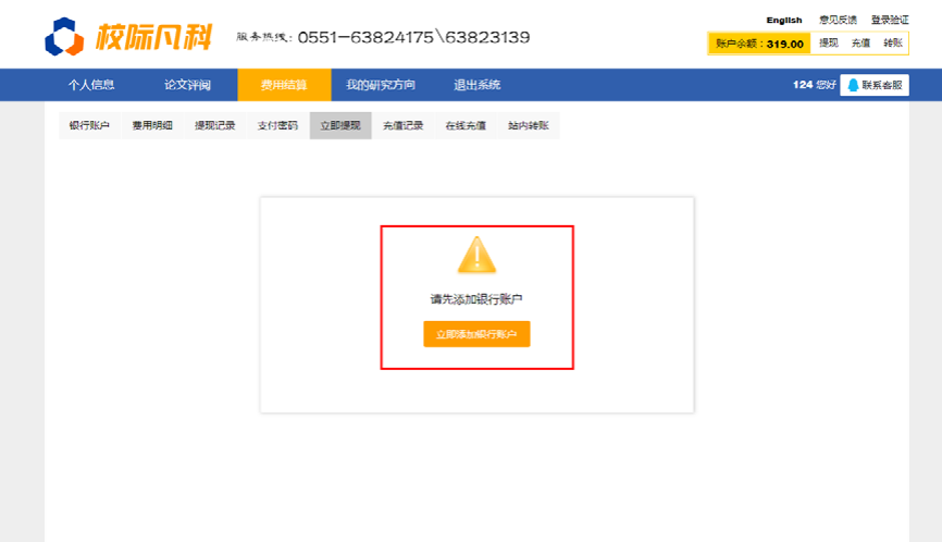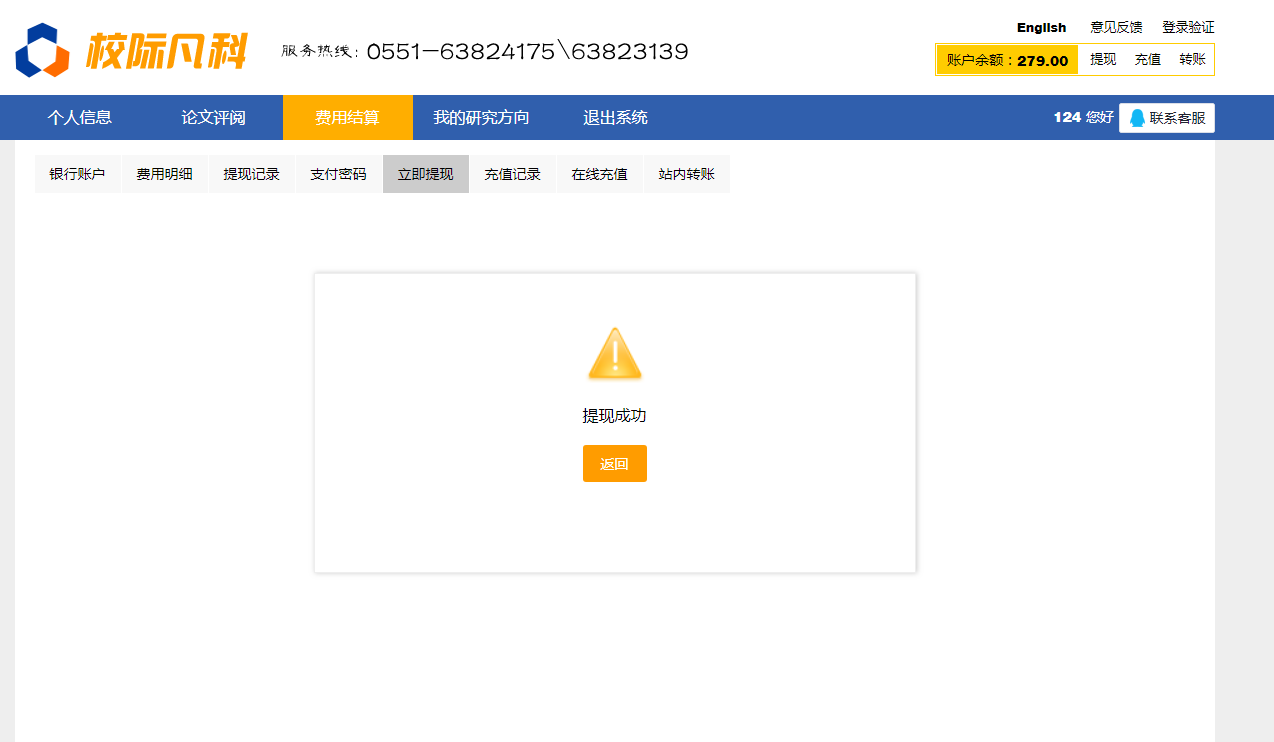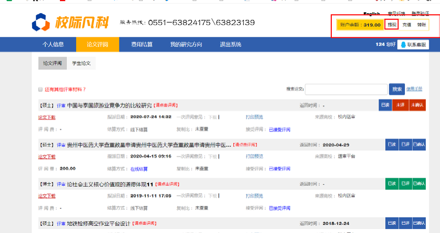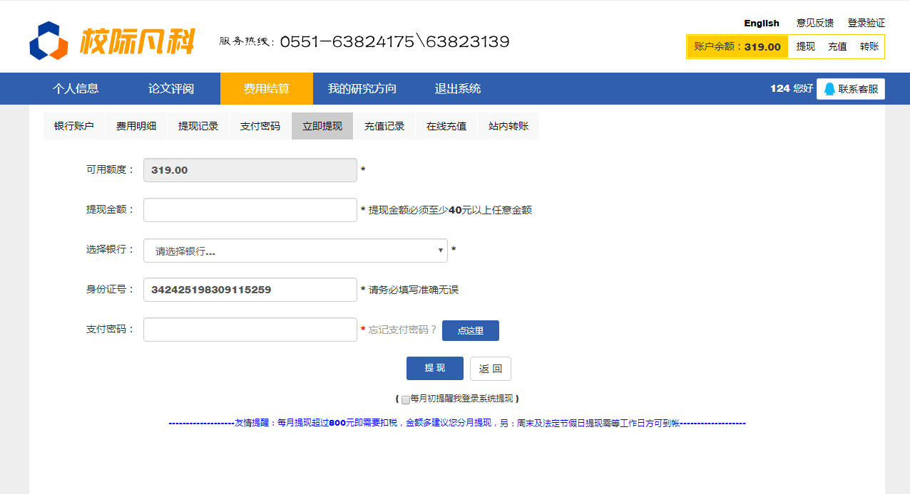 如果结算方式是线下结算或是校内送审的,请联系学校秘书或是分给您论文的老师。 结算方式是“在线结算”的。您点“最终定稿”后,刷新平台,您的账户余额会自动增加本篇论文的评审费。可在线提现(绑定银行卡,设置支付密码, <此处的支付密码并不是您的银<>行卡密码,是您用于平台提现设的密码。用于后期提现用> );