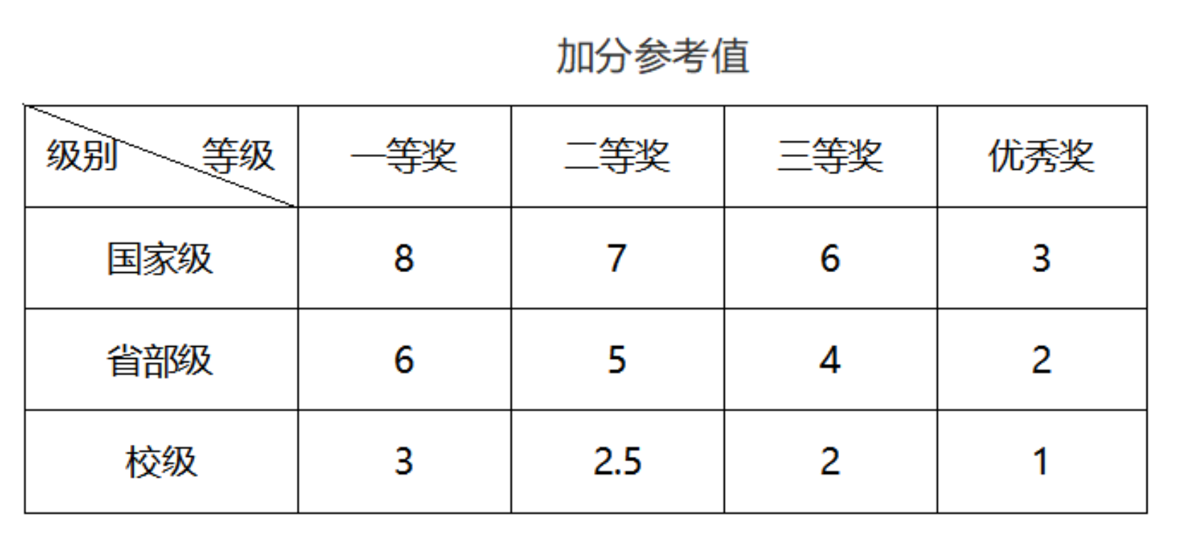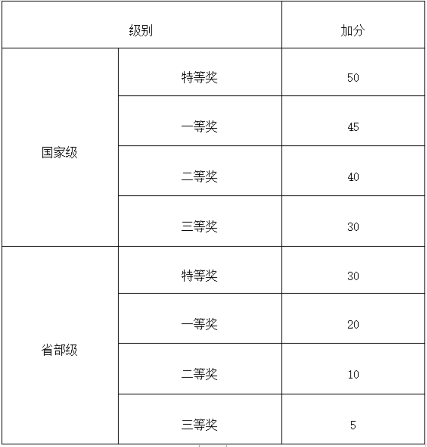 (2)参加科技创新、学科竞赛活动取得各级奖励者,最高按下表加分: