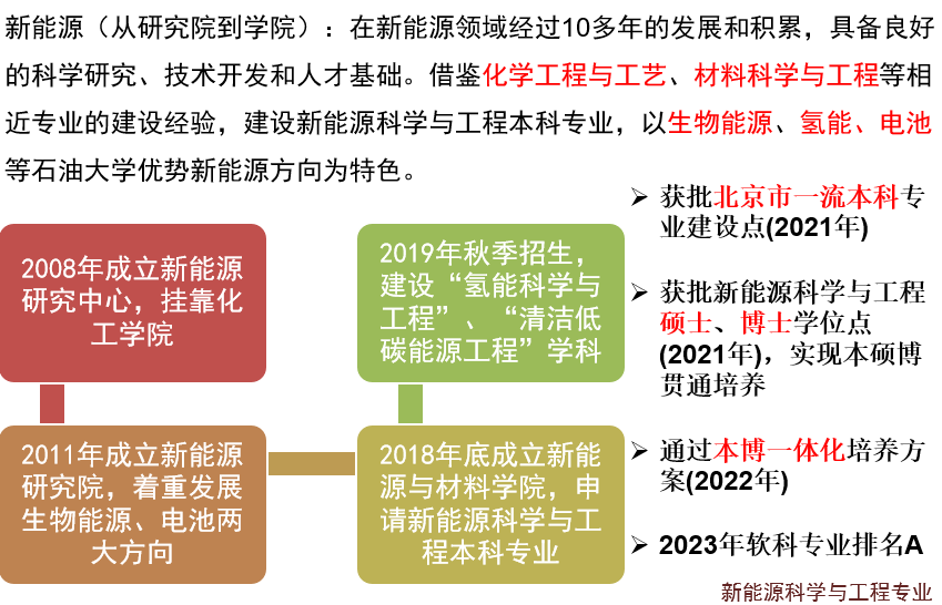 基于对能源行业发展趋势的判断和思考,中国免费靠逼视频立足国家能源战略需求和学科发展前沿布局,2018年在原新能源研究院的基础上,成功申办新能源科学与工程专业,2019年第一次招收本科生70人。2020年获批新能源科学与工程交叉博士学位点,2021年获批新能源科学与工程硕士学位点,实现新能源方向本、硕、博全方位培养。2021年,新能源科学与工程本科专业入选北京市一流专业建设点。2022年,通过新能源本博一体化培养方案。2023年软科新能源专业排名A。2024年与经管学院合办能源经济与新能源工程双学士学位专业。