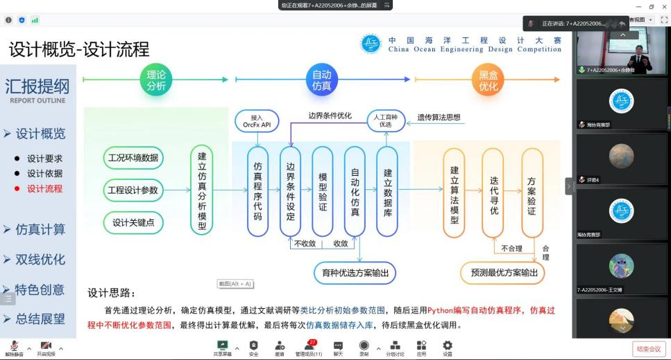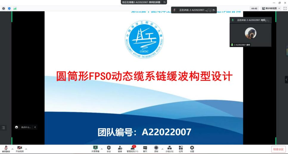 设计制作组以答辩形式开展比赛,来自中海石油(中国)有限公司北京研究中心、中国石油集团海洋工程有限公司的5位专家学者受邀出席,担任本次决赛评委。各参赛队伍以“圆筒形FPSO动态管缆设计”为主题,播放模型演算视频,并从装备结构、设计思路、模拟数据等方面对参赛作品进行了讲解。各评审专家从作品的内容、科技创新性以及工程实践性等方面进行提问,并对各参赛队伍作了点评。