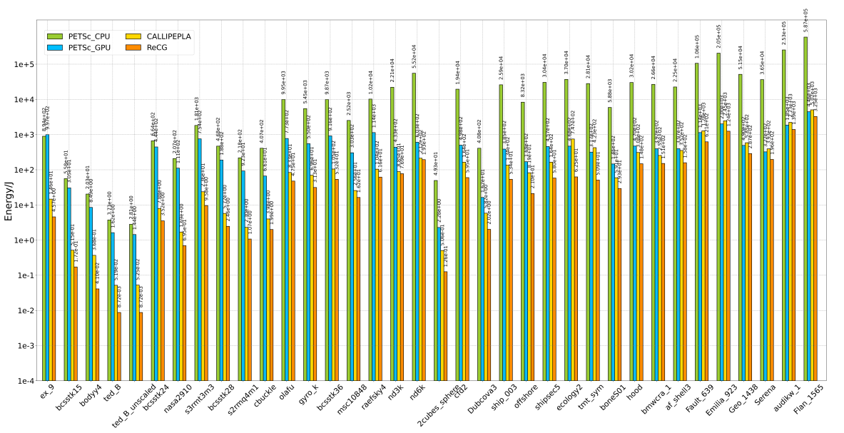 图5:四种加速器:CPU和GPU上的PETSc,CALLIPEPLA和ReCG的能耗