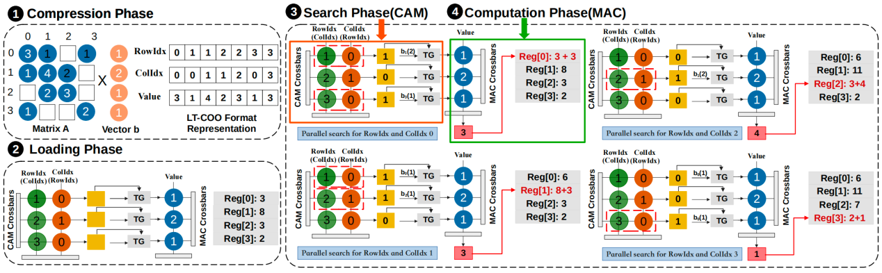 其次,我们发现SpMV在加速CG过程中具有关键作用,是算法迭代中的核心步骤。我们使用图2的例子去描述用ReCG架构中的SPU模块去实现SpMV的工作流程。将实现SpMV的过程分为了四个阶段:压缩阶段,加载阶段,搜索阶段和计算阶段。这四个阶段是顺序执行的,但在同一个阶段中可以同时并行执行多组数据。