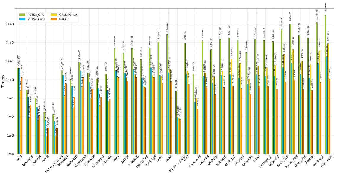 图4:四种加速器:CPU和GPU上的PETSc,CALLIPEPLA和ReCG的求解时间