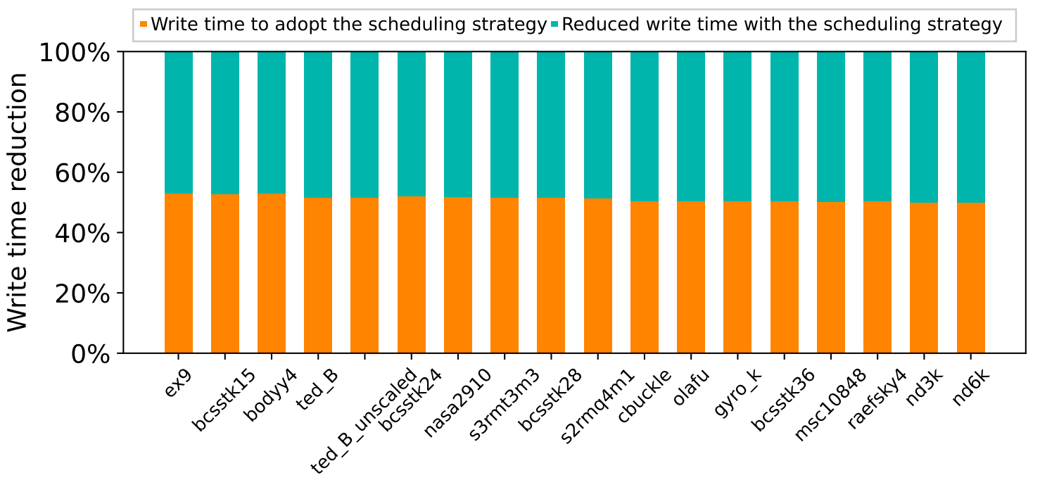 为了尽可能减少ReRAM写耐久性差对加速JPCG所带来的影响,我们制定了新的调度策略。在这个调度策略之下,大大减少了在ReRAM上的写时间,如图6所示。我们可以看出采用新的调度策略后,写时间减少了50%左右,验证了调度策略的有效性。