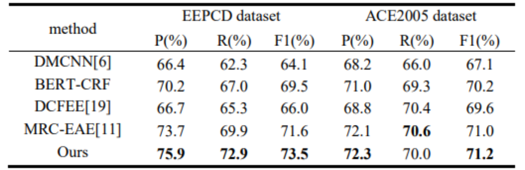 本文设置了对比实验,在EEPCD数据集与ACE2005数据集上与其他主流算法对比。通过表3可以看出,本文提出的模型,在EEPCD数据集上无论是准确率、召回率还是F1值都有显著提升;而在ACE 2005数据集上虽然召回率没有提升,但在准确率和F1值上都明显优于其他模型。
