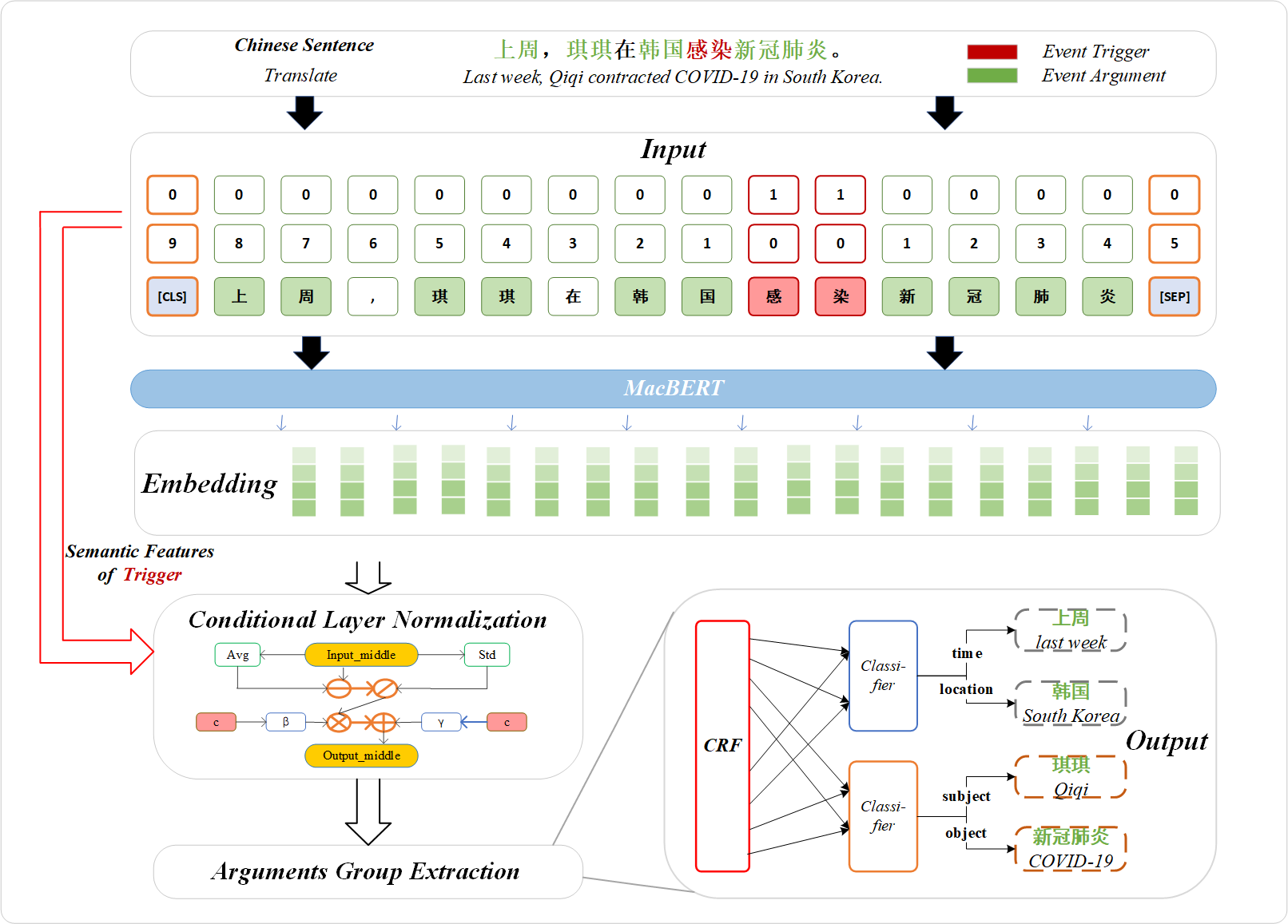 (2)条件层归一化 (CLN):使用语义信息作为一个额外的条件,与词向量一起输入到神经网络的输入层中。在网络的中间层中,使用 CLN进行归一化,从而使得不同的语义信息可以自适应地学习到适合的归一化参数。最后,可以将归一化后的表示输入到一个分类器或者序列标注模型中,用于抽取事件论元。