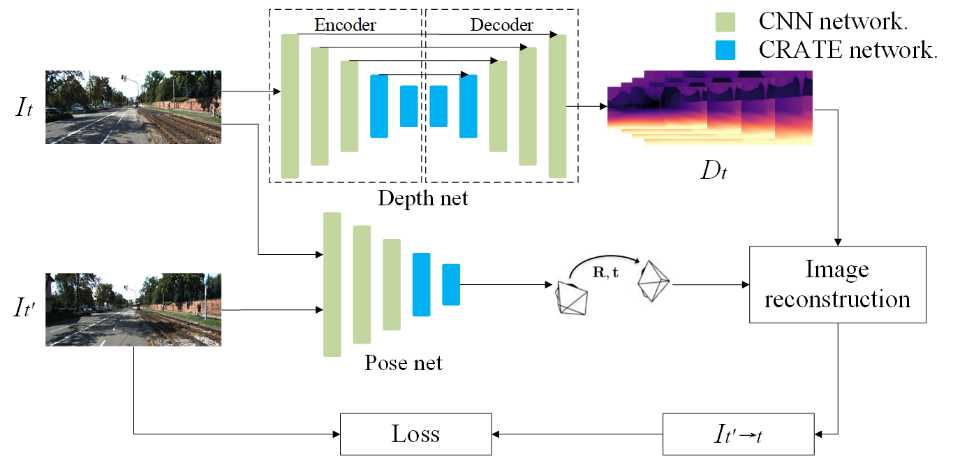 当前关于深度估计模型的研究主要集中在提高模型的预测精度方面,然而,过多的参数阻碍了模型在边缘设备上的通用部署。此外,目前常用的神经网络作为黑盒模型,其内部工作原理无法被数学解释,导致其性能难以被改进。为了缓解这些问题,本文提出了一种全新的、具有混合结构的自监督深度估计网络CCDepth,该网络由卷积神经网络(CNN)和白盒CRATE(Coding RAte reduction TransformEr)网络组成。这个全新的网络使用CNN和CRATE网络层分别提取图像中的局部和全局信息,从而提高网络学习能力、降低模型参数量。此外,通过CRATE网络的加入,本文提出的模型可以在捕捉全局特征的过程中被数学解释。