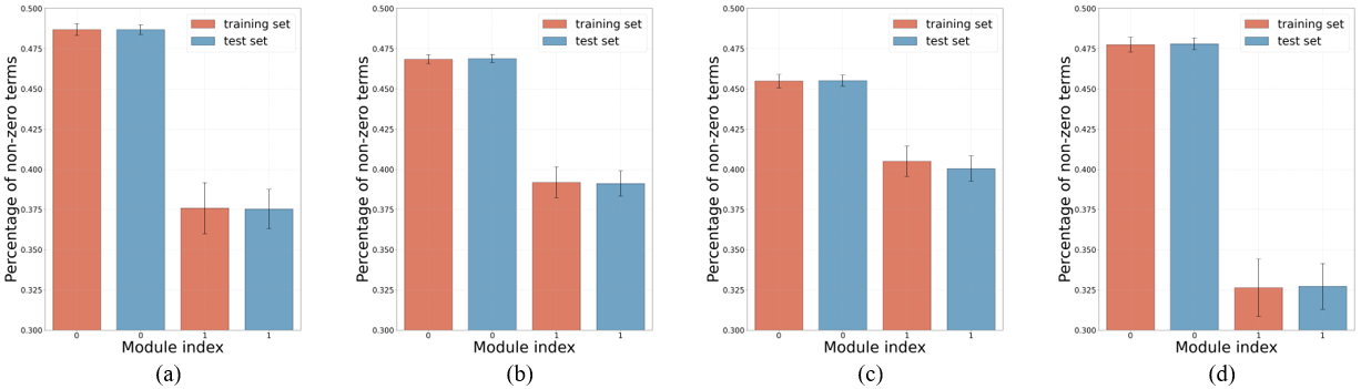 图7 CRATE网络层内各模块输出的非零项占比对比,(a)CCDepth中第一个CRATE网络层的结果,(b)CCDepth中第二个CRATE网络层的结果,(c)CCDepth中第三个CRATE网络层的结果,(d)CCDepth中第四个CRATE网络层的结果。