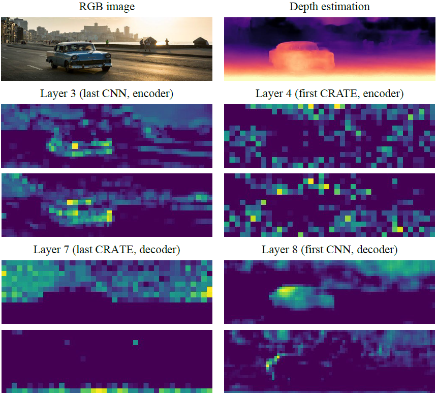 图7所示,为CRATE网络内部各模块输出的非零项占比对比,可以分析得到,CRATE网络在深度估计任务中有效地为所有数据实现压缩(去噪)和稀疏化,将特征向低秩转化,以更好地暴露全局信息。