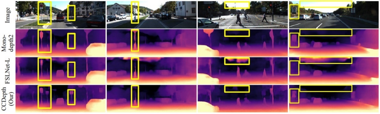 表1所示,为本文提出的CCDepth模型与现有先进模型的定量对比结果。CCDepth在KITTI测试集的预测误差和精度上取得了更好的表现。同时,模型参数量仅有12.6M,相较于Monodepth2和FSLNet分别下降78.8%和23.6%。