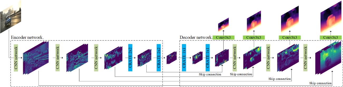 本文提出了一种全新的深度估计网络CCDepth,该网络通过CNN和CRATE分别提取图像的细节和全局信息,以实现在自监督深度估计任务中高效地提取有用特征。相比较于现有的先进模型,CCDepth拥有更高的准确度,显著降低了模型参数量,并提升了网络可解释性。