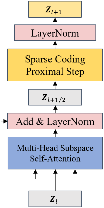图4为CRATE网络的基础模块结构图,网络由多头子空间自注意力模块(Multi-Head Subspace Self-Attention block,MSSA)和一个迭代收缩阈值算法模块(Iterative Shrinkage-Thresholding Algorithms block,ISTA)构成,分别担任压缩(去噪)和稀疏化的操作。
