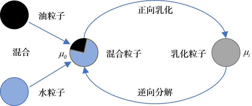 海面溢油污染通常包括扩散过程和风化过程,风化过程中乳化阶段产生的油水乳化物的流变性会发生变化,随着时间的推移直接影响其扩散过程。如图2所示,将Rasmussen模型中乳化反应视为平衡反应,即