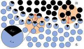 Cahn等提出了基于统计热力学描述相分离过程的Cahn-Hilliard方程,已在多相流研究中得到了广泛应用。本文将Cahn-Hillard方程与海面原油泄漏扩散模拟结合,得到离散化可以得到粒子的相分离方程为: