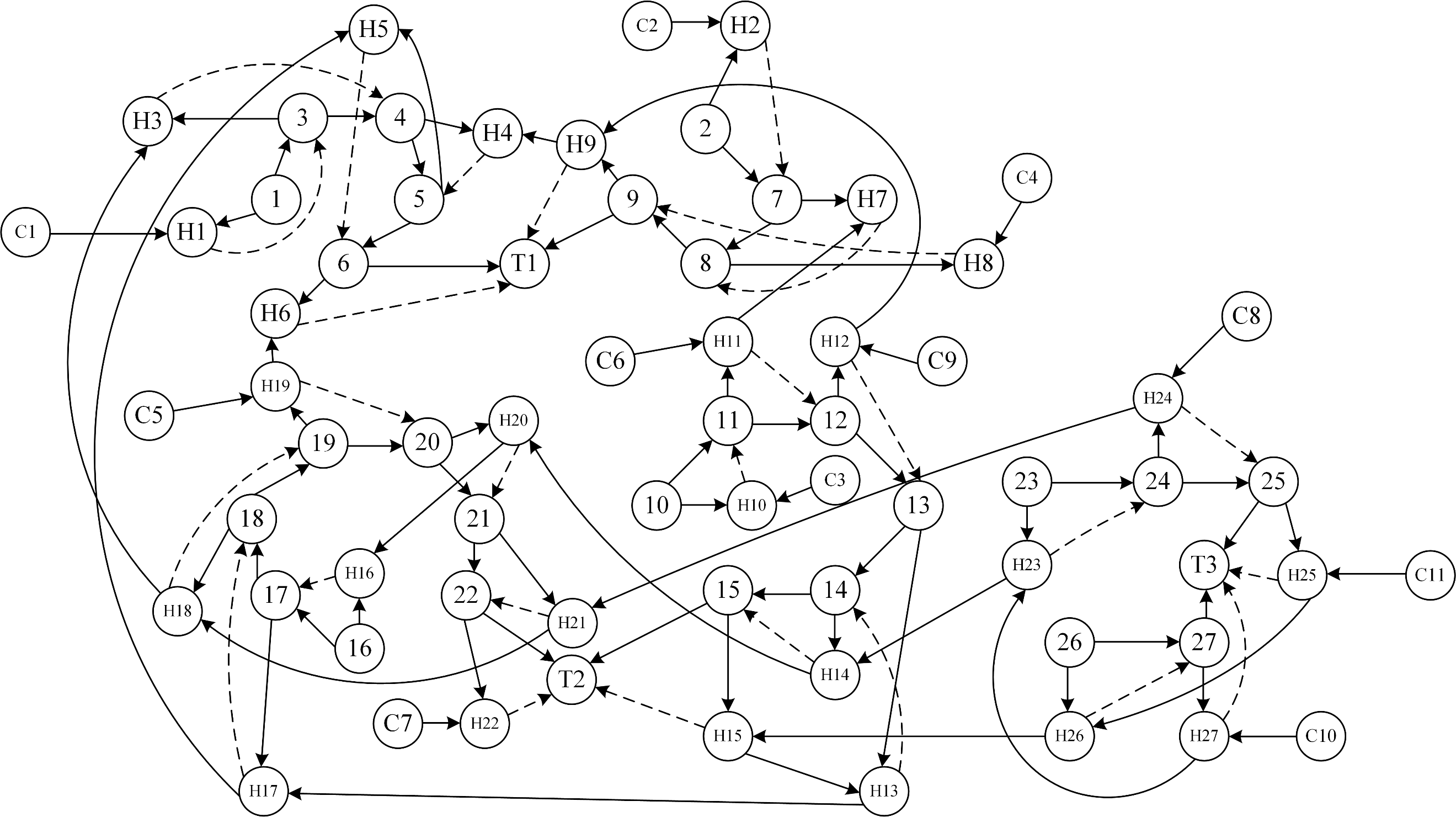 本文为确定换热网络中的关键变量,建立一个复杂原油换热网络的SDG模型。如图所示,其中,节点表示换热网络中的流股温度,有向边表示换热流股之间的关系。复杂原油换热网络的SDG模型:R可由以下四部分组成。