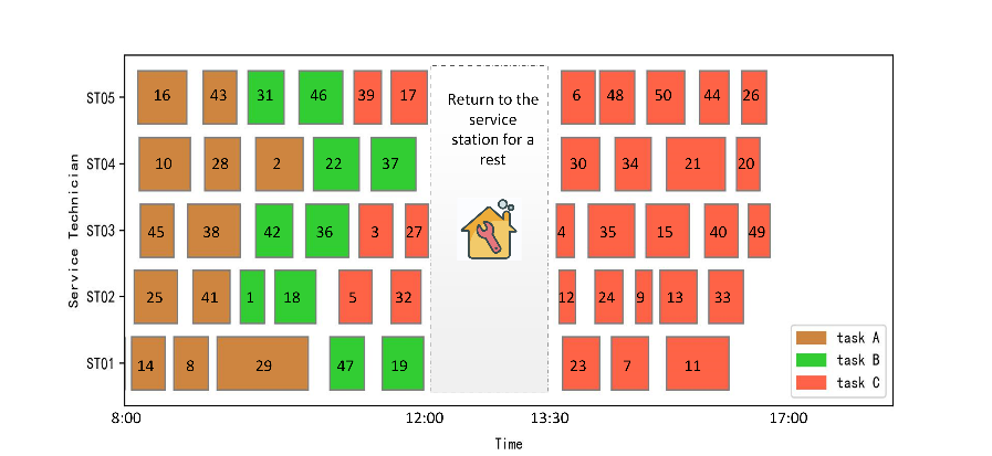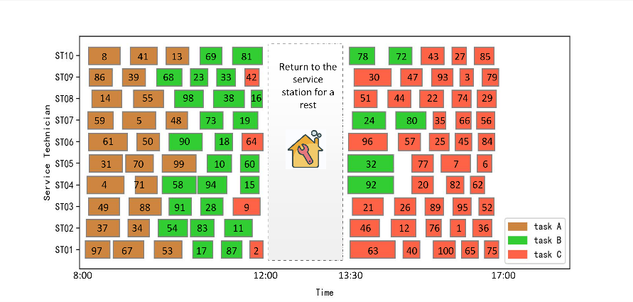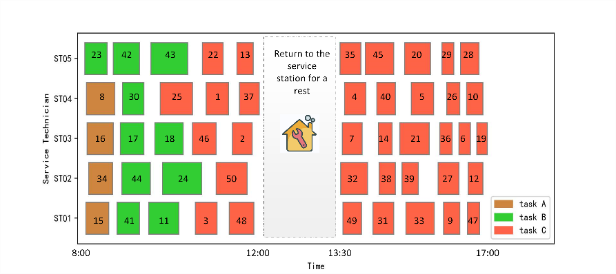 图2和3展示了5个服务技术人员和50个维修任务的维修任务调度问题的两个实例的调度结果。类似地,图4和5显示了具有10个服务技术人员和100个维修任务的两个实例的调度结果。结果表明,使用TSGAT+Q学习框架可以成功地为这些案例生成可行的解决方案。