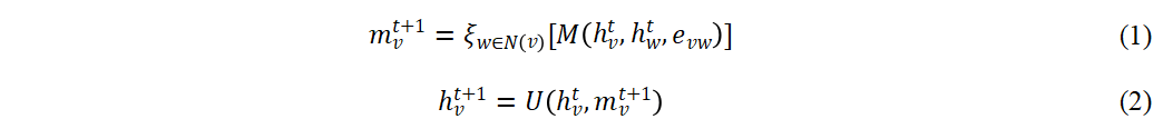 为了解决该框架中计算节点和边缘特征嵌入的问题,引入了组合消息传递神经网络(CMPNN)。CMPNN是消息传递神经网络(MPNN)的改进版本。MPNN的流程由式1和2表示。
