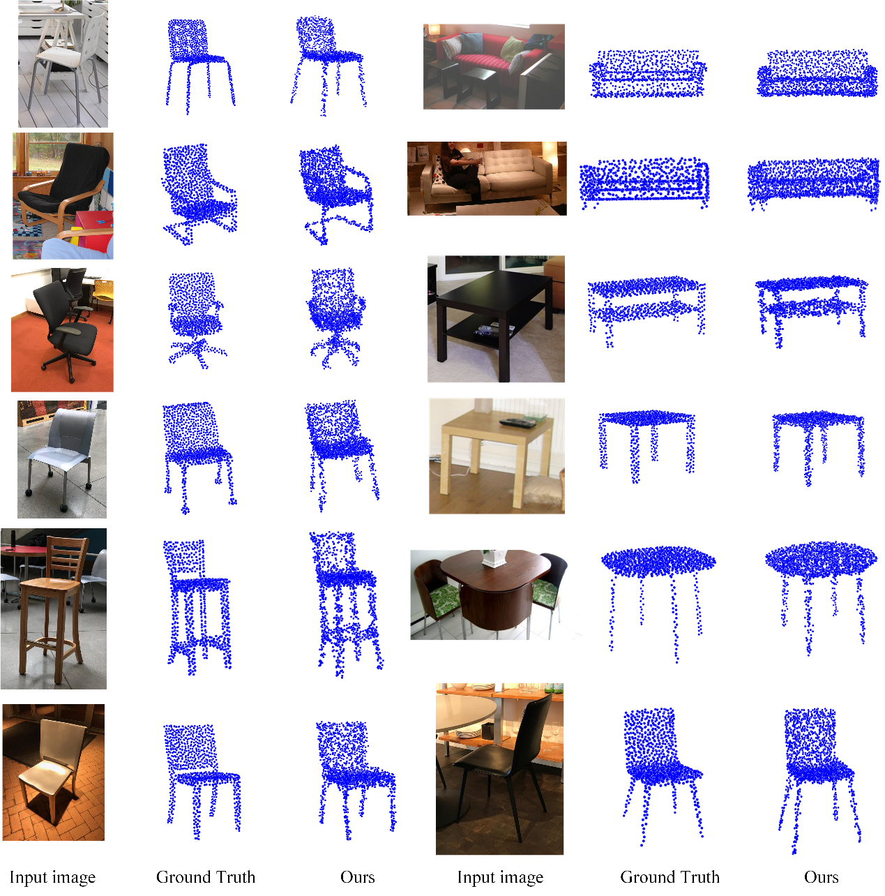 图3为部分真实场景图像的三维重建结果。可以看出,本文方法对于双层结构的桌子、椅子等复杂结构的重建细节更加准确,能够有效地保持点云模型形变局部拓扑结构的一致性。